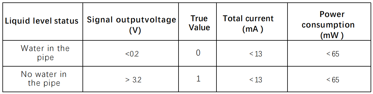 A voltage signal consistent with the water level condition . This signal is used as Liquid level control signal access to MCU (MCU) I/O Ports When there is water in the pipe, the signal output is low voltage. When there is no water in the pipe, the signal output is high voltage. The